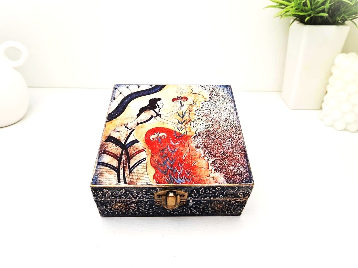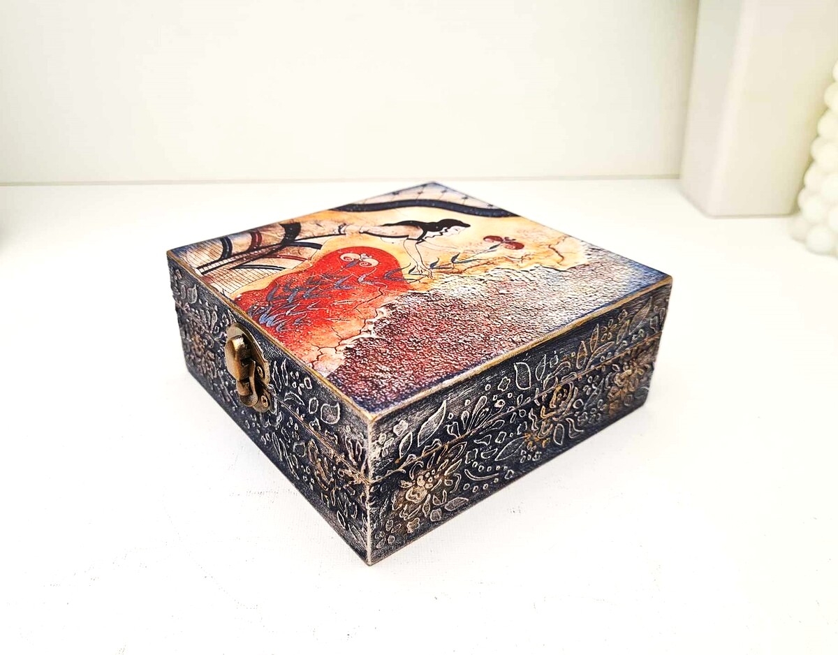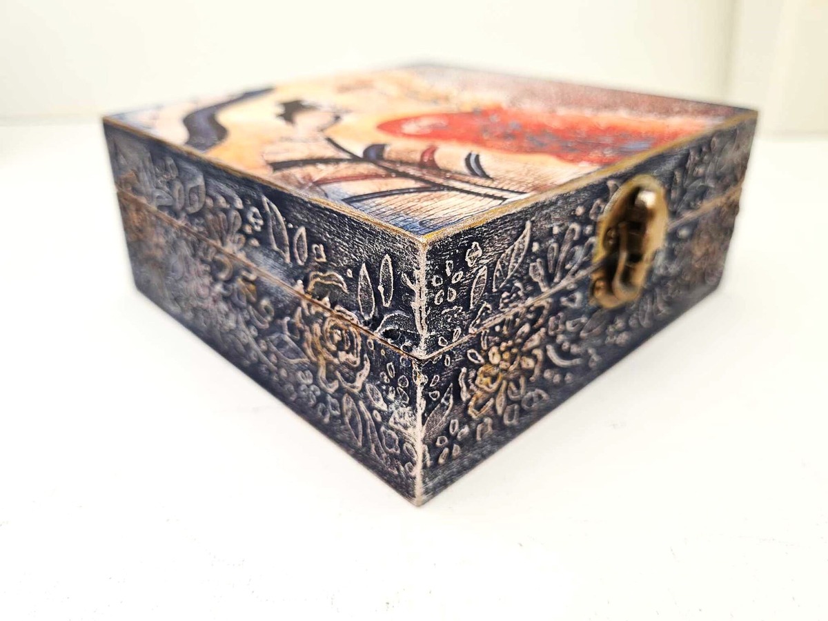 Ένα κουτί 100% χειροποίητο φιλοτεχνημένο με μικτές τεχνικές, ακρυλικά χρώματα, βερνίκι, χαρτί, πάστες, πηλό κλπ δουλεμένο με αγάπη και λεπτομέρεια μέσα και έξω. Ιδανικό για εσάς ή ένα μοναδικό δώρο που θα εκτιμηθεί δεόντως.
