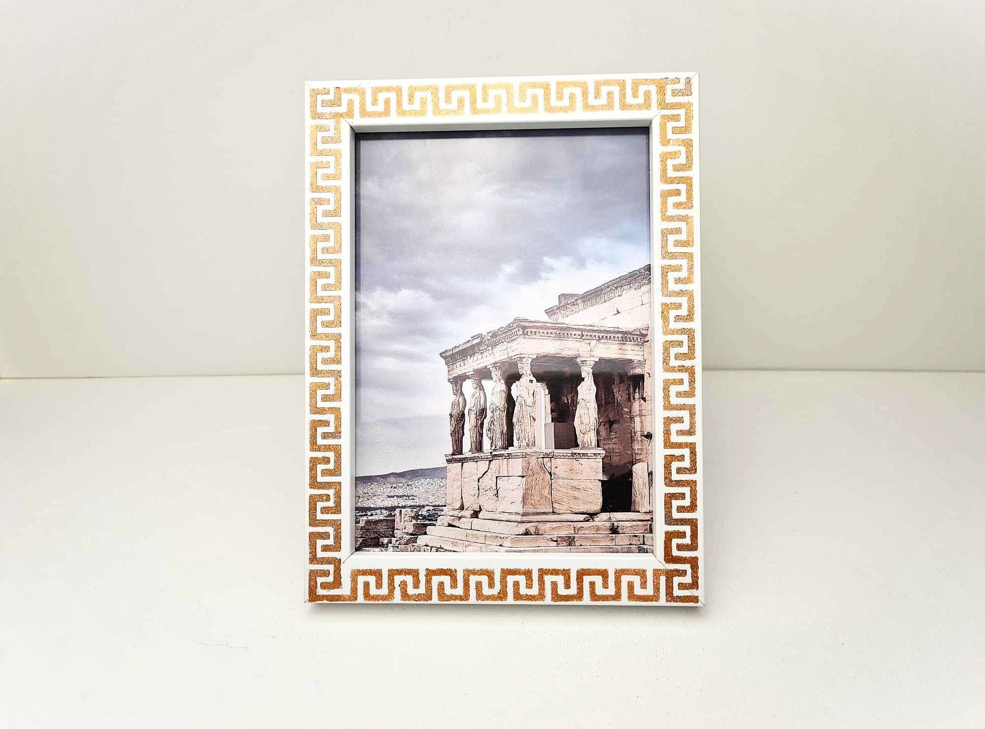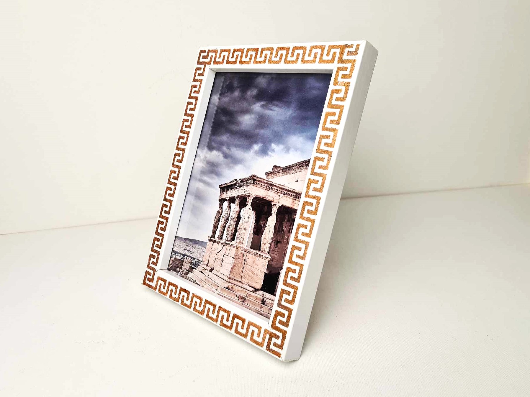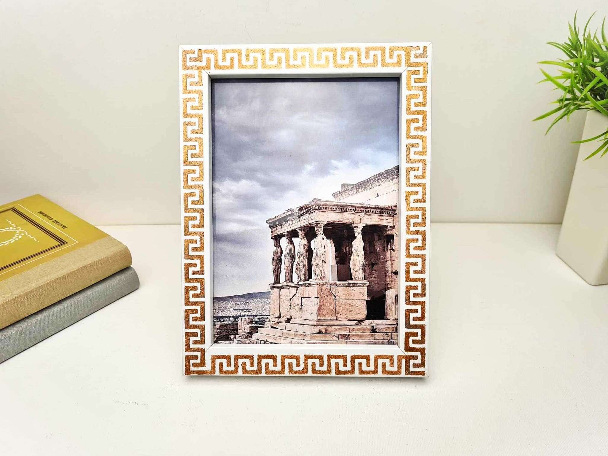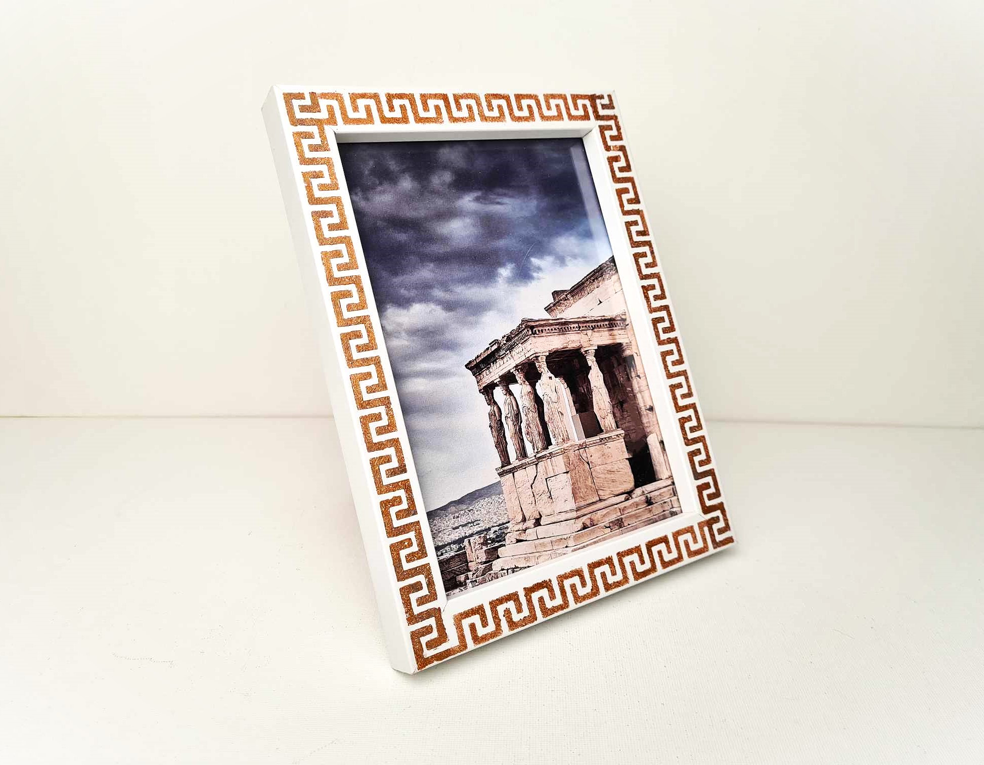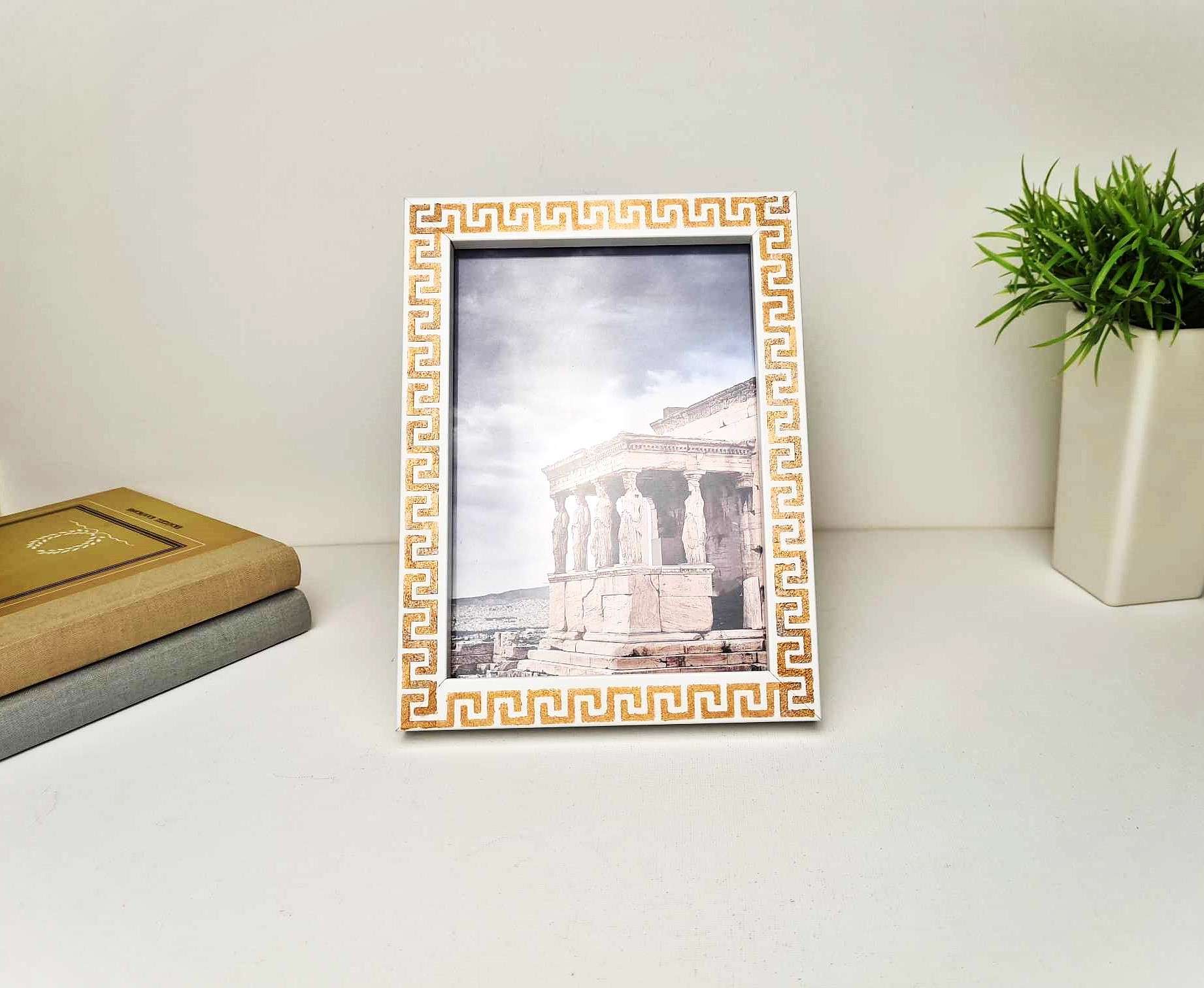 Μια ξύλινη κορνίζα φωτογραφιών με την διαχρονική γοητεία του Μαιάνδρου του αρχαιότερου ελληνικού συμβόλου  που απεικονίζει το άπειρο, την ενότητα και την αιώνια ροή. Είναι αποτυπωμένο στο χέρι με ακρυλικά χρώματα και το MDF πλαίσιο σε συνδυασμό με το γυαλί, προστατεύει τις φωτογραφίες και προσφέρει ένα κομψό πλαίσιο που ολοκληρώνει τη διακόσμηση του σπιτιού σας με στυλ και φινέτσα.