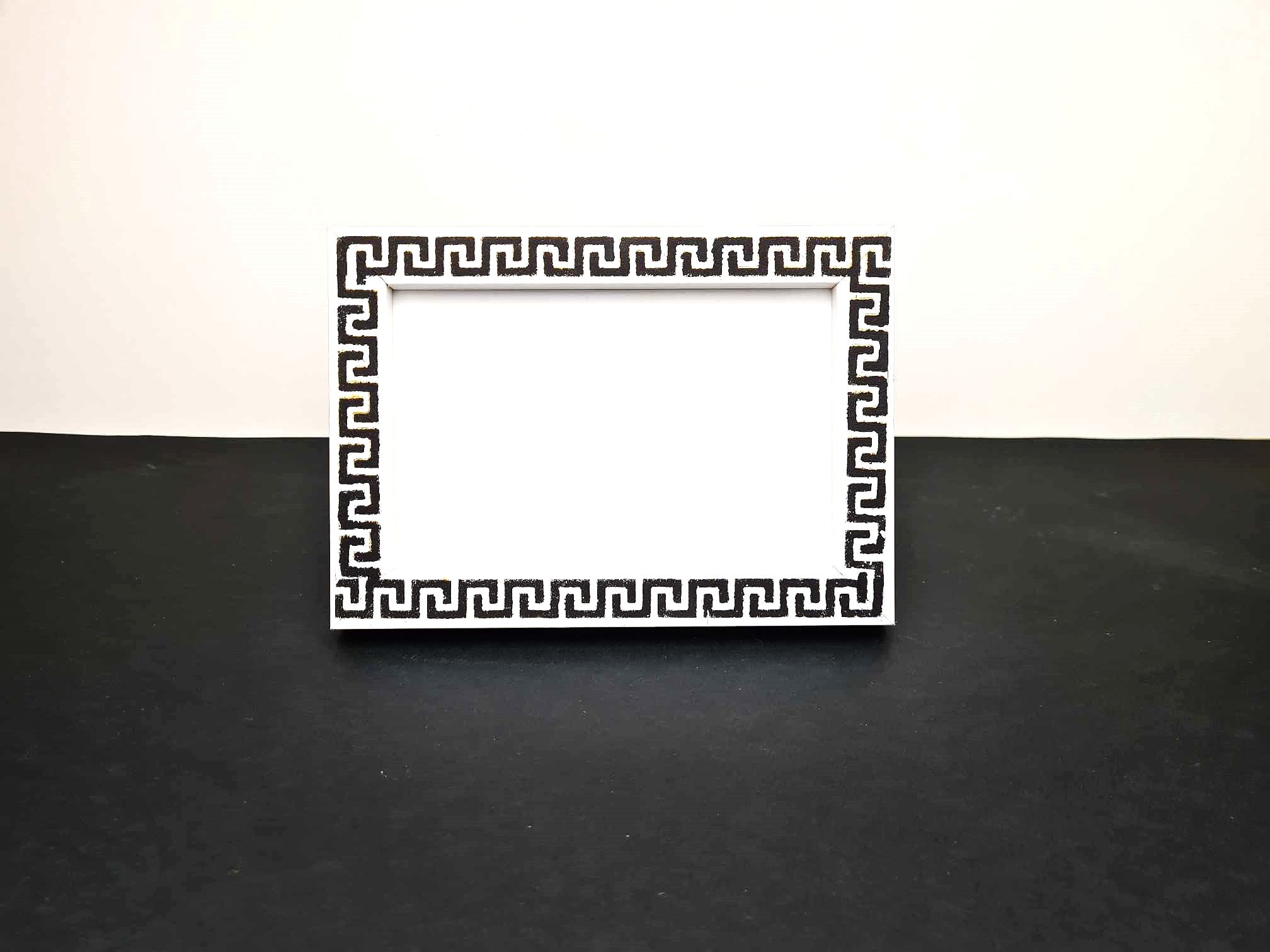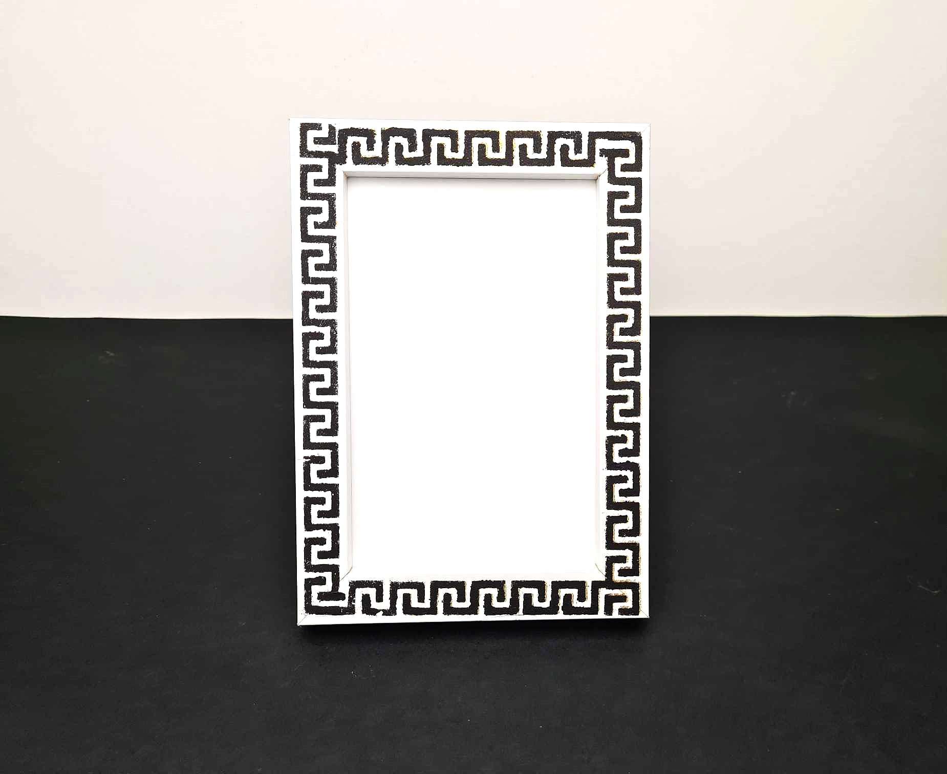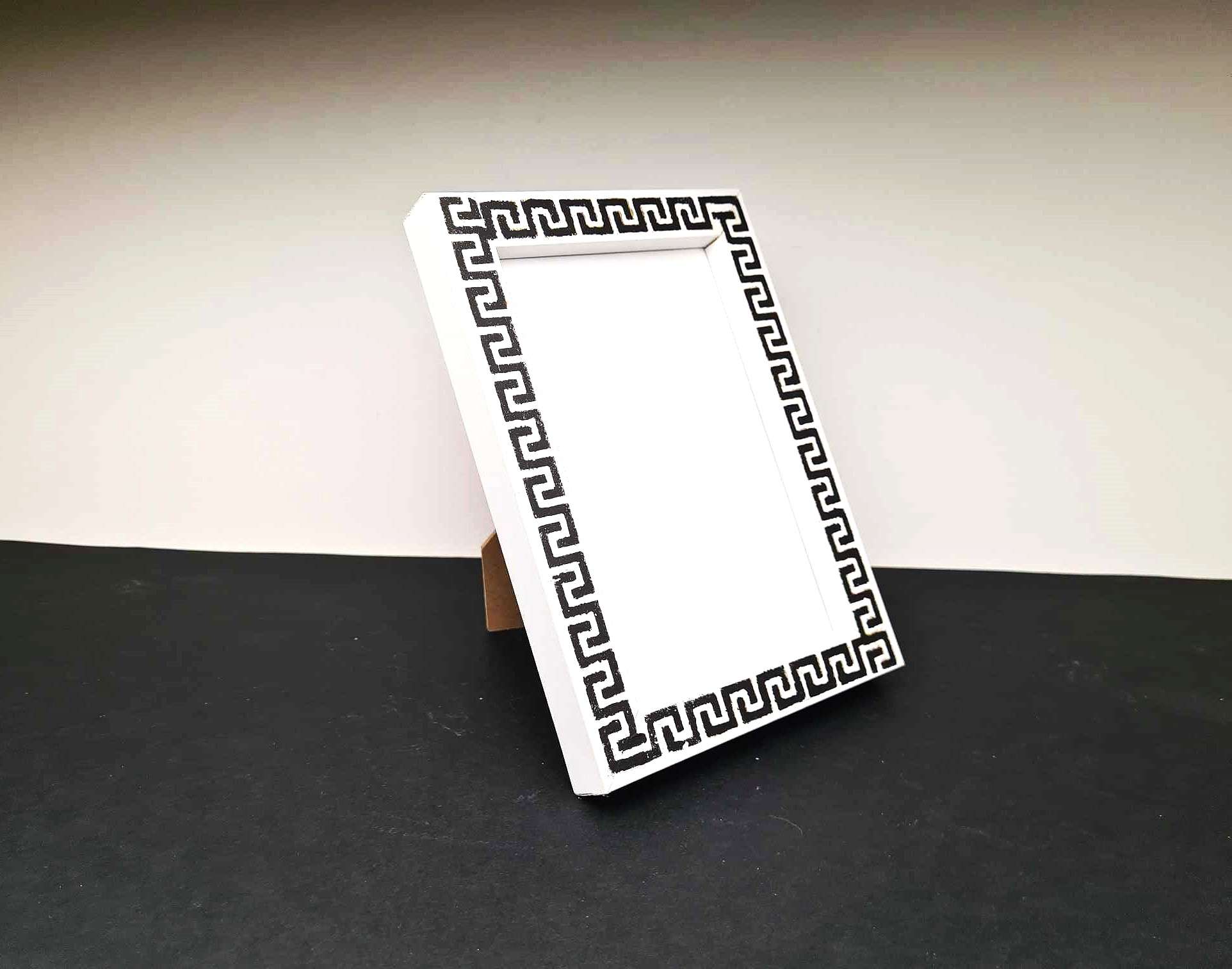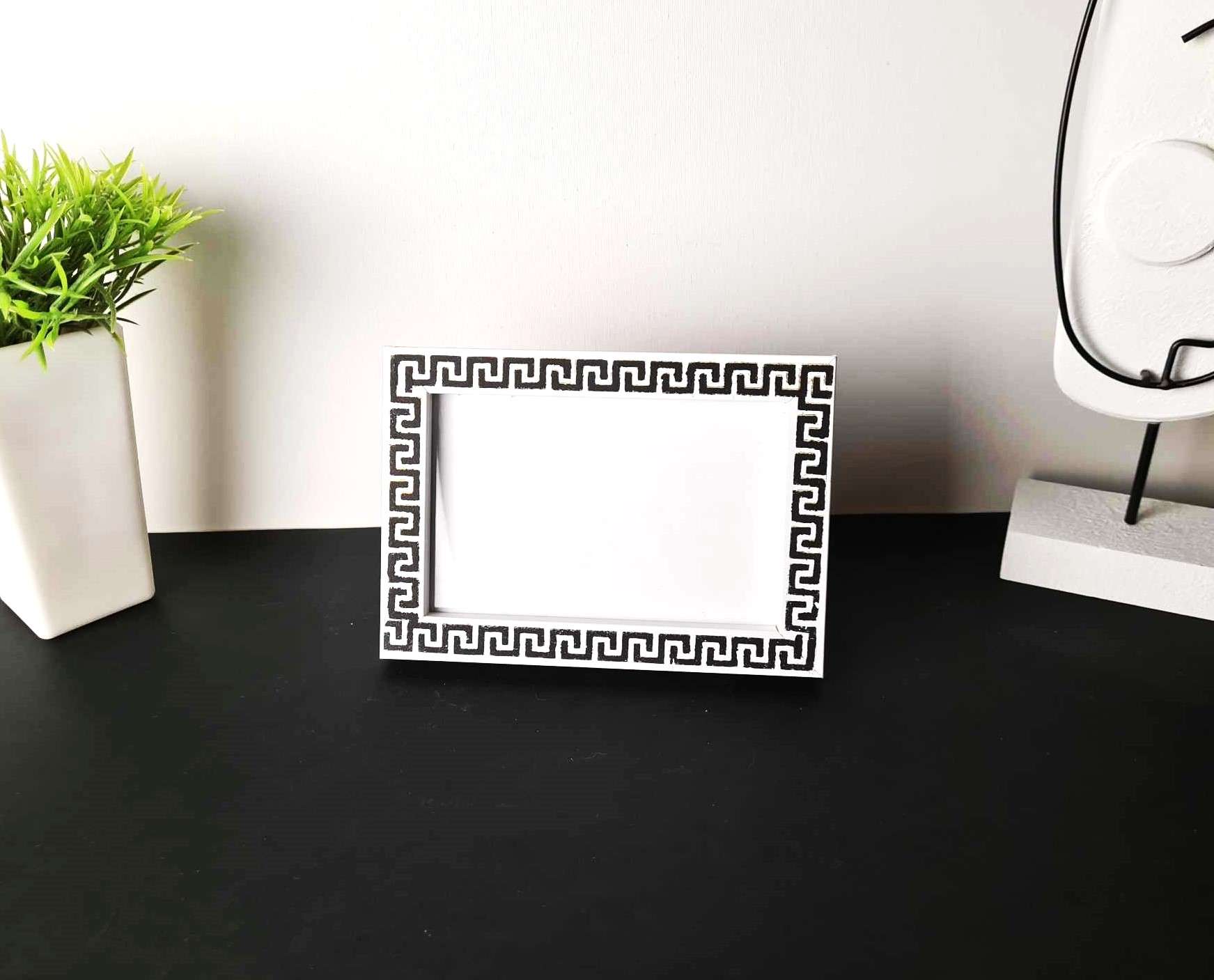 Μια ξύλινη κορνίζα φωτογραφιών με την διαχρονική γοητεία του Μαιάνδρου του αρχαιότερου ελληνικού συμβόλου  που απεικονίζει το άπειρο, την ενότητα και την αιώνια ροή. Είναι αποτυπωμένο στο χέρι με ακρυλικά χρώματα και το MDF πλαίσιο σε συνδυασμό με το γυαλί, προστατεύει τις φωτογραφίες και προσφέρει ένα κομψό πλαίσιο που ολοκληρώνει τη διακόσμηση του σπιτιού σας με στυλ και φινέτσα.