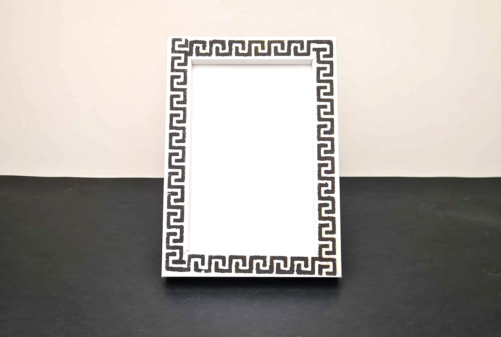 korniza-aspri-2Ξύλινη Κορνίζα Άσπρη με Μαύρο Μαίανδρο 17.5×12.5x2cm