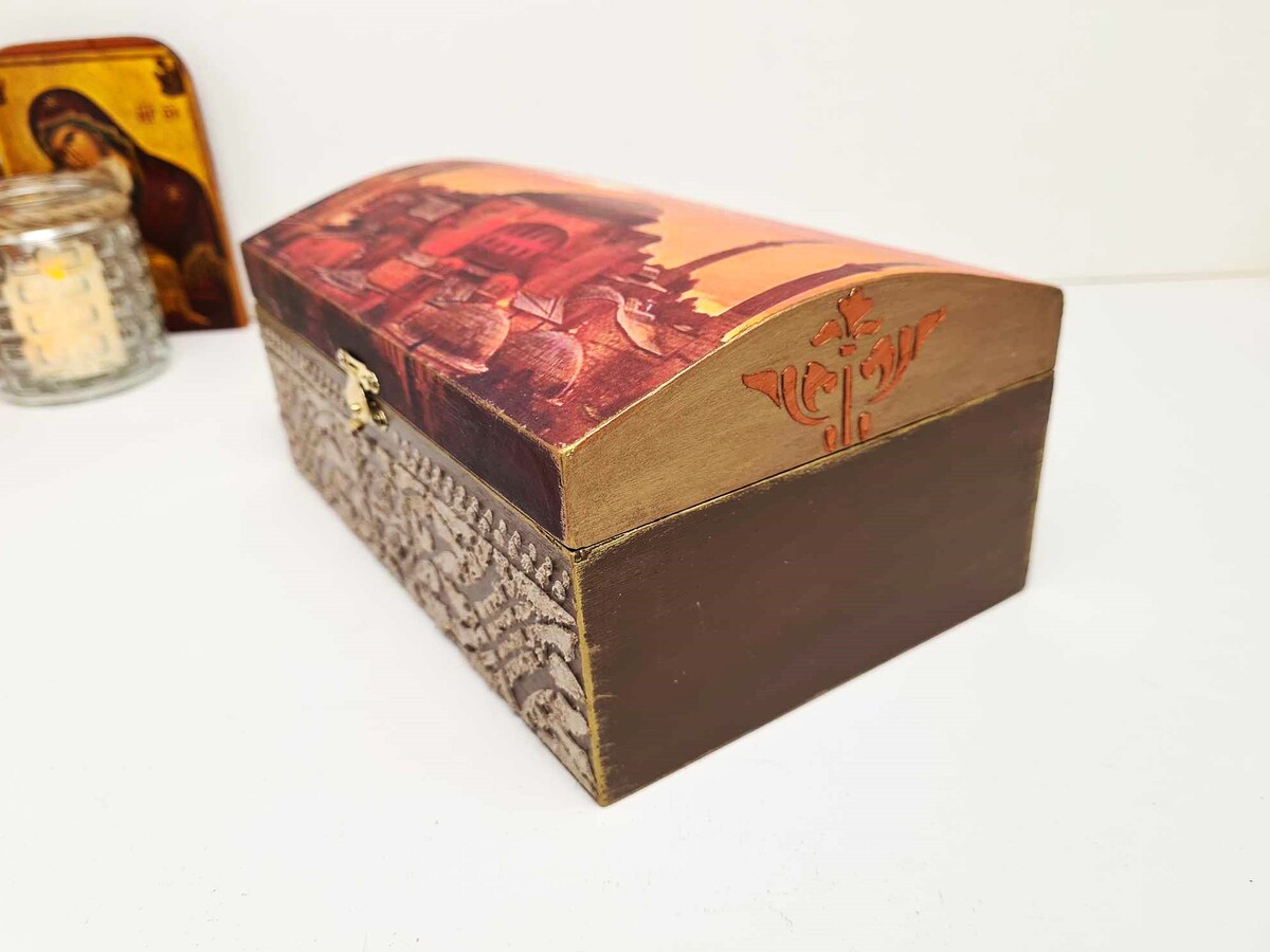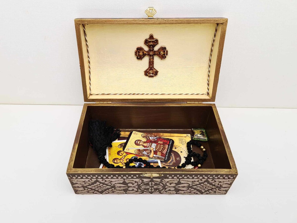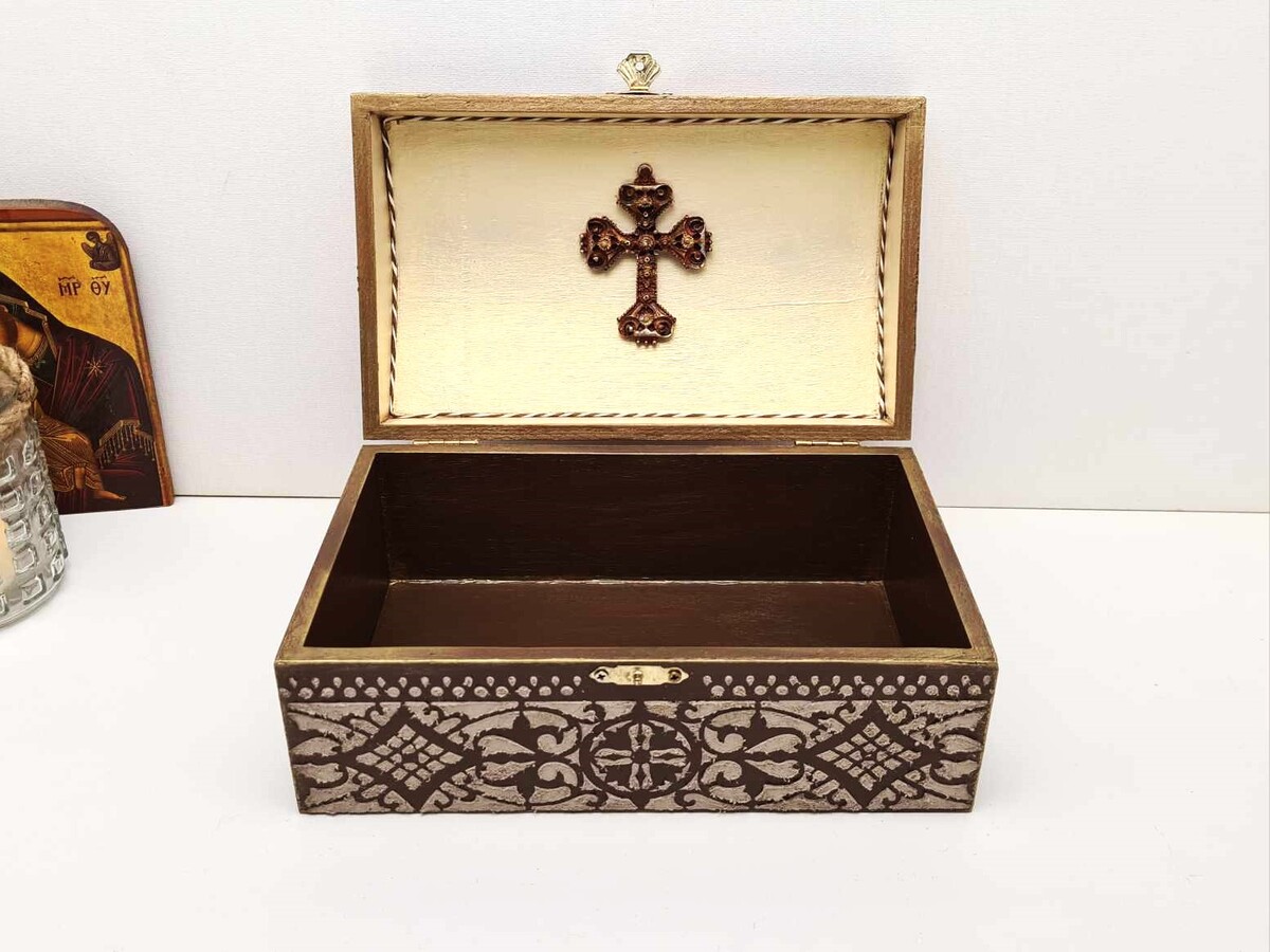 Ξύλινο Ορθόδοξο κουτί 100% χειροποίητο φτιαγμένο με φροντίδα και σεβασμό για τη θρησκεία μας. Ως Ορθόδοξοι Χριστιανοί, έχουμε πολλά ιερά αντικείμενα που έχουμε συλλέξει ή έχουμε λάβει ως δώρα όπως: μικρές εικονίτσες, σταυρουδάκια, αγίασμα, κομποσκοίνια, προσευχητάρια κ.λπ. Θα ήταν ιδανικό να έχετε ένα τέτοιο μοναδικό και πρωτότυπο κουτί βυζαντινής τεχνοτροπίας όπως αυτό, για να φυλάσσετε όλα αυτά τα πολύτιμα αντικείμενα σε ένα μέρος στο σπίτι ή το γραφείο σας. Μια εξαιρετική ιδέα δώρου που θα εκτιμηθεί δεόντως από τον παραλήπτη του.