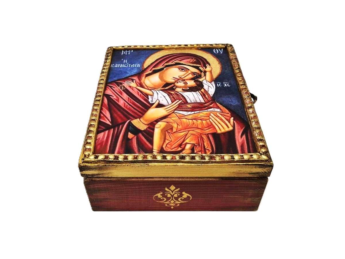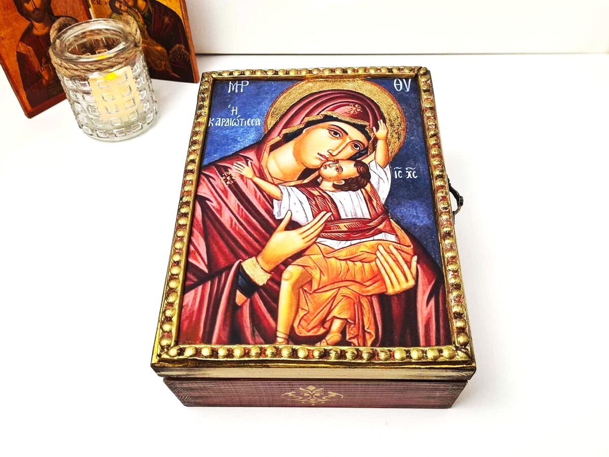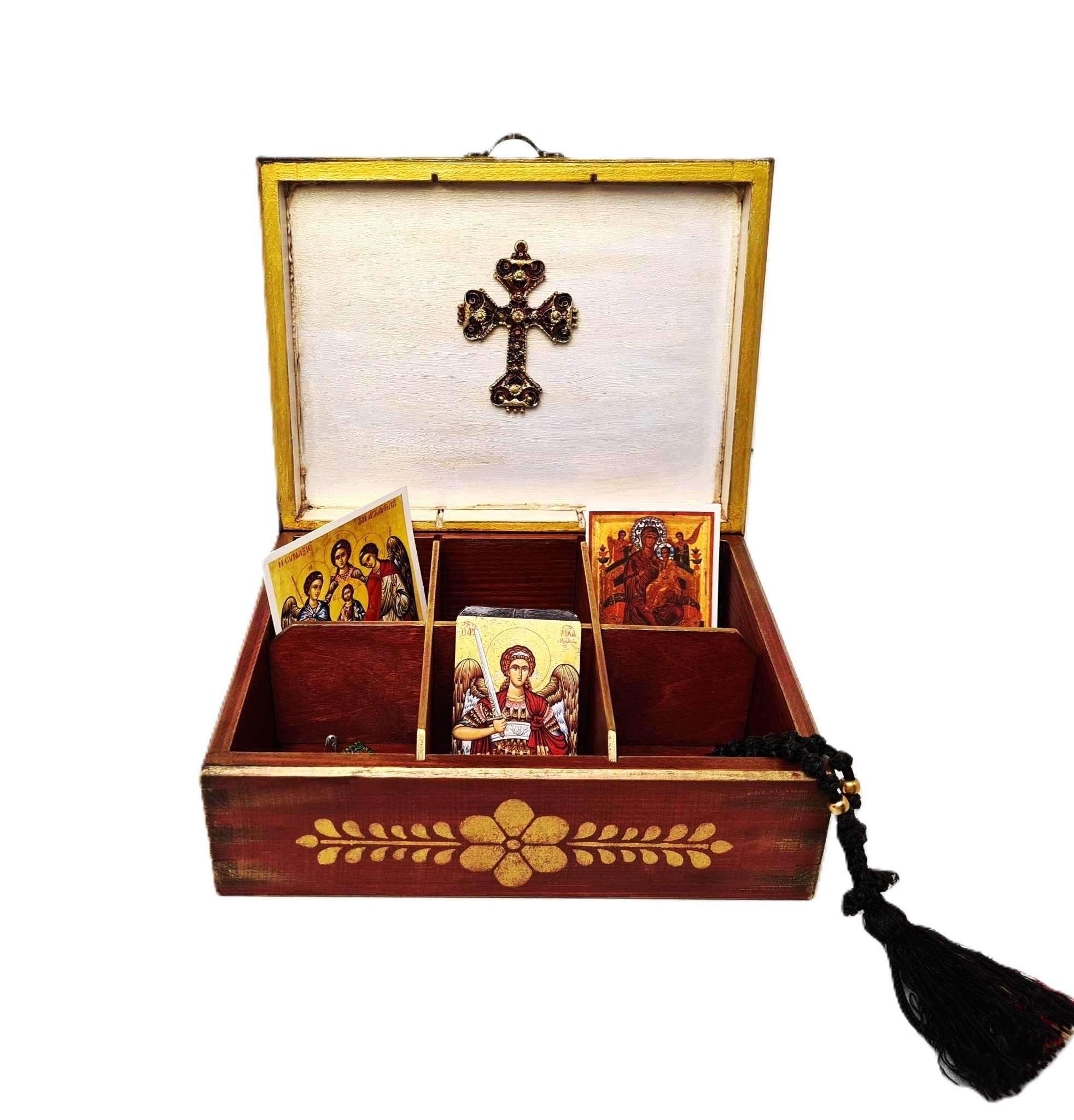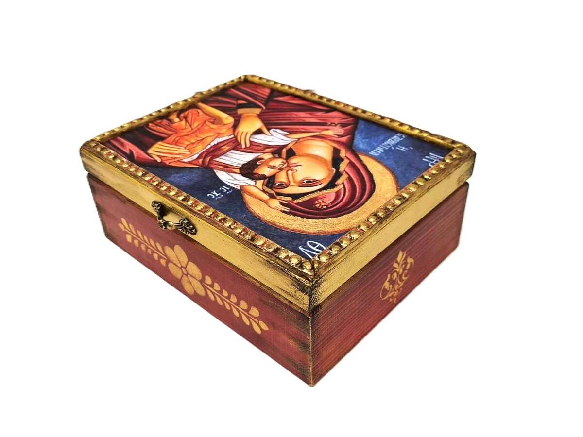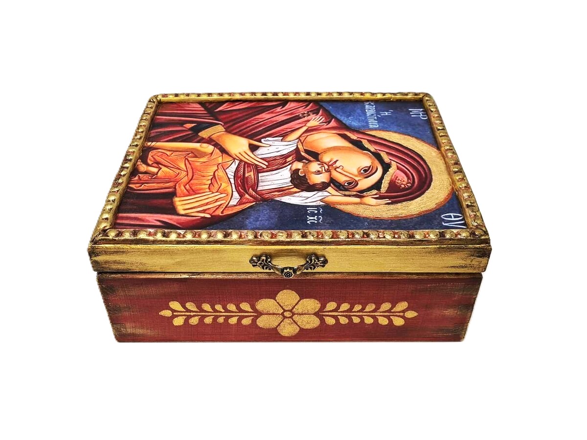 Χριστιανικό Ορθόδοξο ξύλινο Κουτί Χειροποίητο 100% φιλοτεχνημένο με μικτές τεχνικές, ακρυλικά χρώματα, βερνίκι, χαρτί, πηλό, πάστες κλπ όλα υλικά φιλικά προς το περιβάλλον και δουλεμένο με σεβασμό, αγάπη και λεπτομέρεια μέσα και έξω. Ιδανικό για εσάς ή ένα μοναδικό δώρο που θα εκτιμηθεί δεόντως από τον παραλήπτη του.