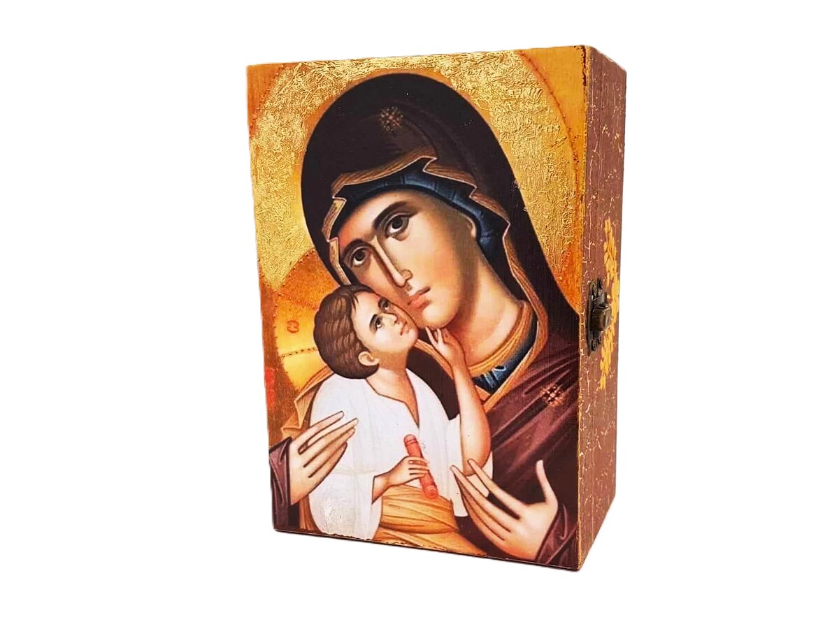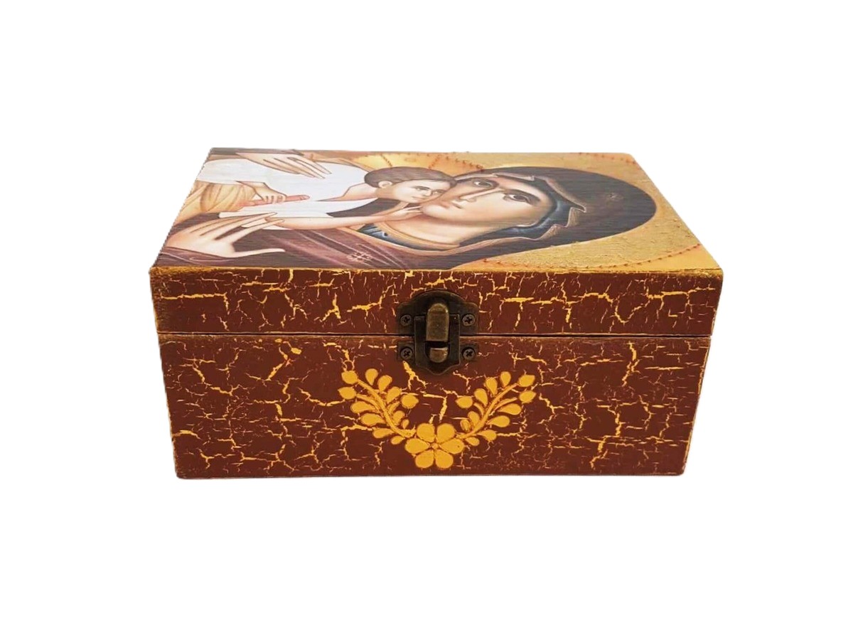 Ξύλινο κουτί οργάνωσης 100% χειροποίητο φτιαγμένο με φροντίδα και σεβασμό για τη θρησκεία μας. Ως Ορθόδοξοι Χριστιανοί, έχουμε πολλά ιερά αντικείμενα που έχουμε συλλέξει ή έχουμε λάβει ως δώρα όπως: μικρές εικονίτσες, σταυρούς, μπουκαλάκια με αγιασμένο λάδι, κομποσκοίνια, προσευχητάρια κ.λπ. Θα ήταν υπέροχο να έχετε ένα τέτοιο μοναδικό και πρωτότυπο κουτί βυζαντινής τεχνοτροπίας όπως αυτό, για να φυλάσσετε όλα αυτά τα πολύτιμα αντικείμενα σε ένα μέρος στο σπίτι ή το γραφείο σας. Μια τέλεια ιδέα δώρου που θα εκτιμηθεί δεόντως από τον παραλήπτη του.
